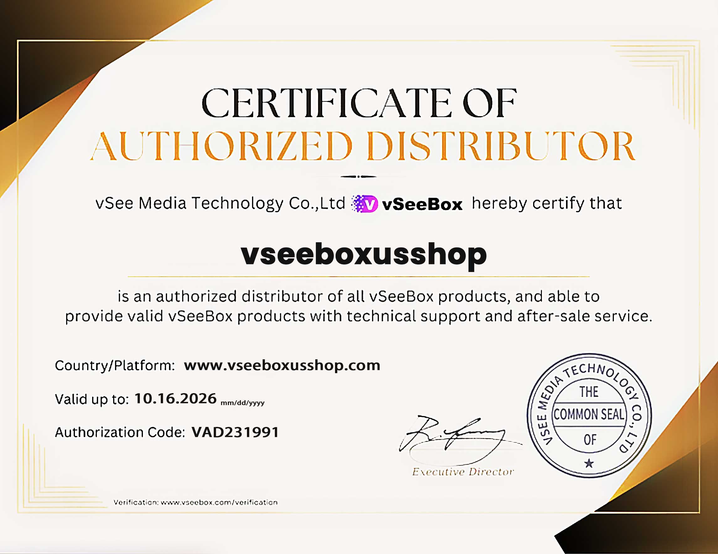vSeeBox Certificate of Authorized Distributor Verification