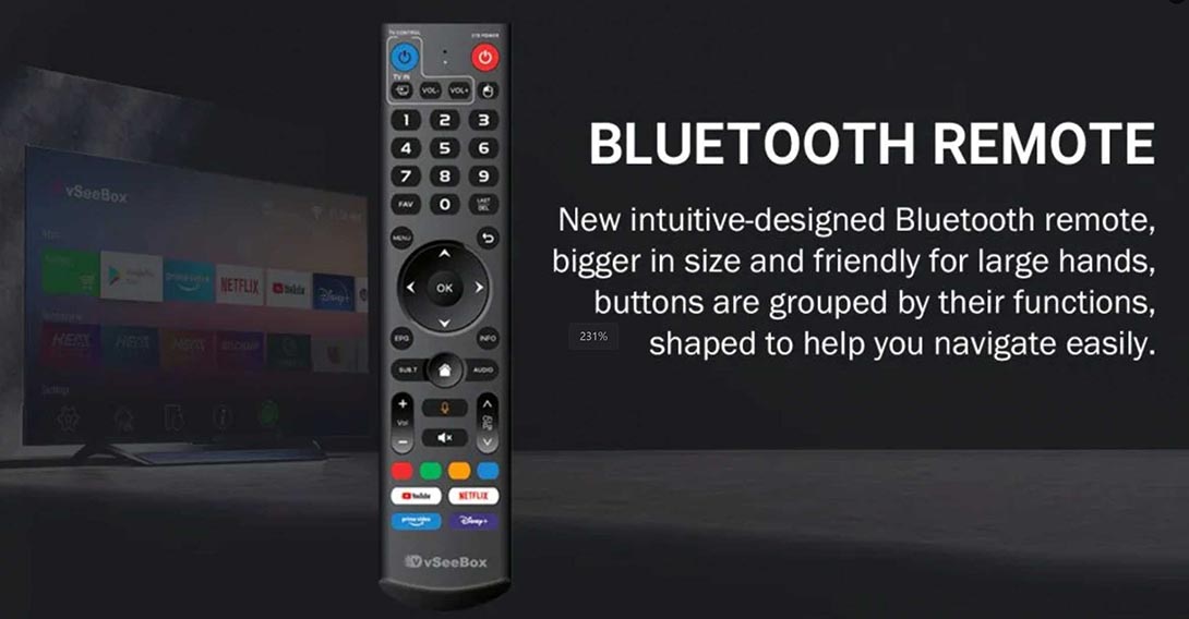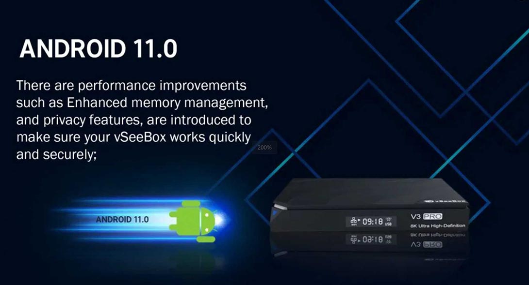 • Upgraded to Android 11 TV System, there are performance improvements such as Enhanced memory management, and privacy features, are introduced to make sure your vSeeBox works quickly and securely;