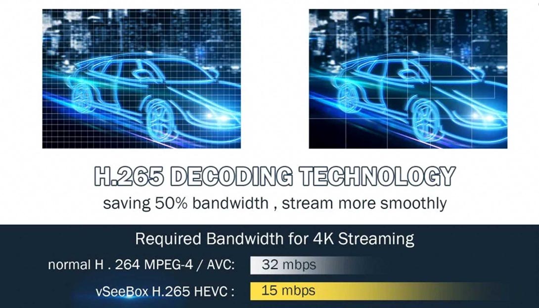 vSeeBox V3 Pro uses H.265/HEVC decoding technology, which is a successor to H.264/AVC. Compared to H.264, H.265 image processing technology makes the data compression ratio doubled at the same level of video quality and saves 50% of network bandwidth resources, which makes you watch movies more smoothly with the same picture quality loaded and enjoy a high-quality experience with less buffering.