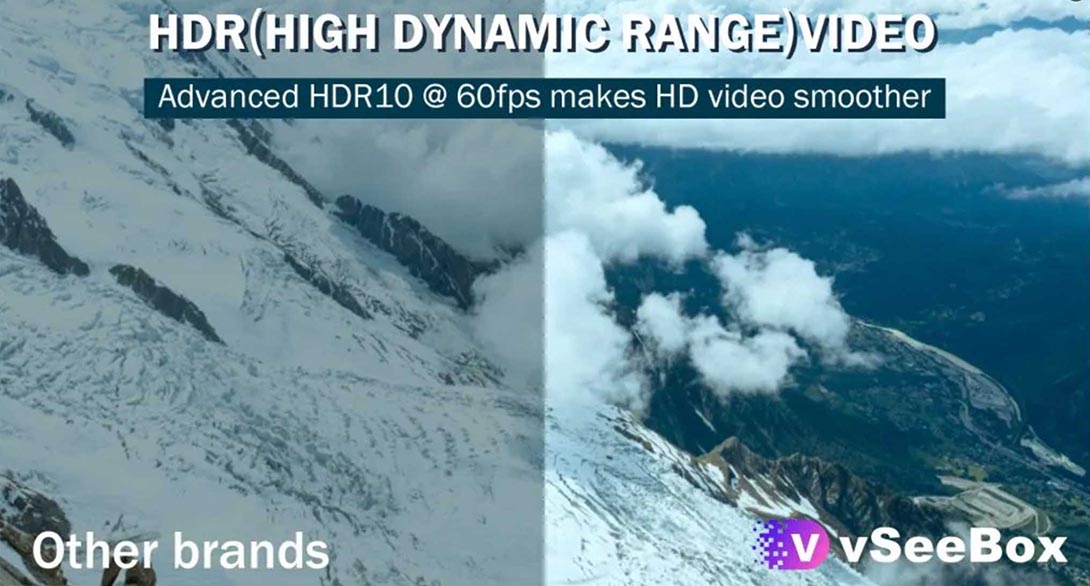VSeeBox V3 Pro supports HDR10 technologies and HDMI2.0 frame rate can go up to 60fps. With HDR technology you can watch HDR videos in vivid contrast, color and clarity. Enjoy the incredible picture crispness and dramatic detail 4K Ultra HD and 1080p resolution.