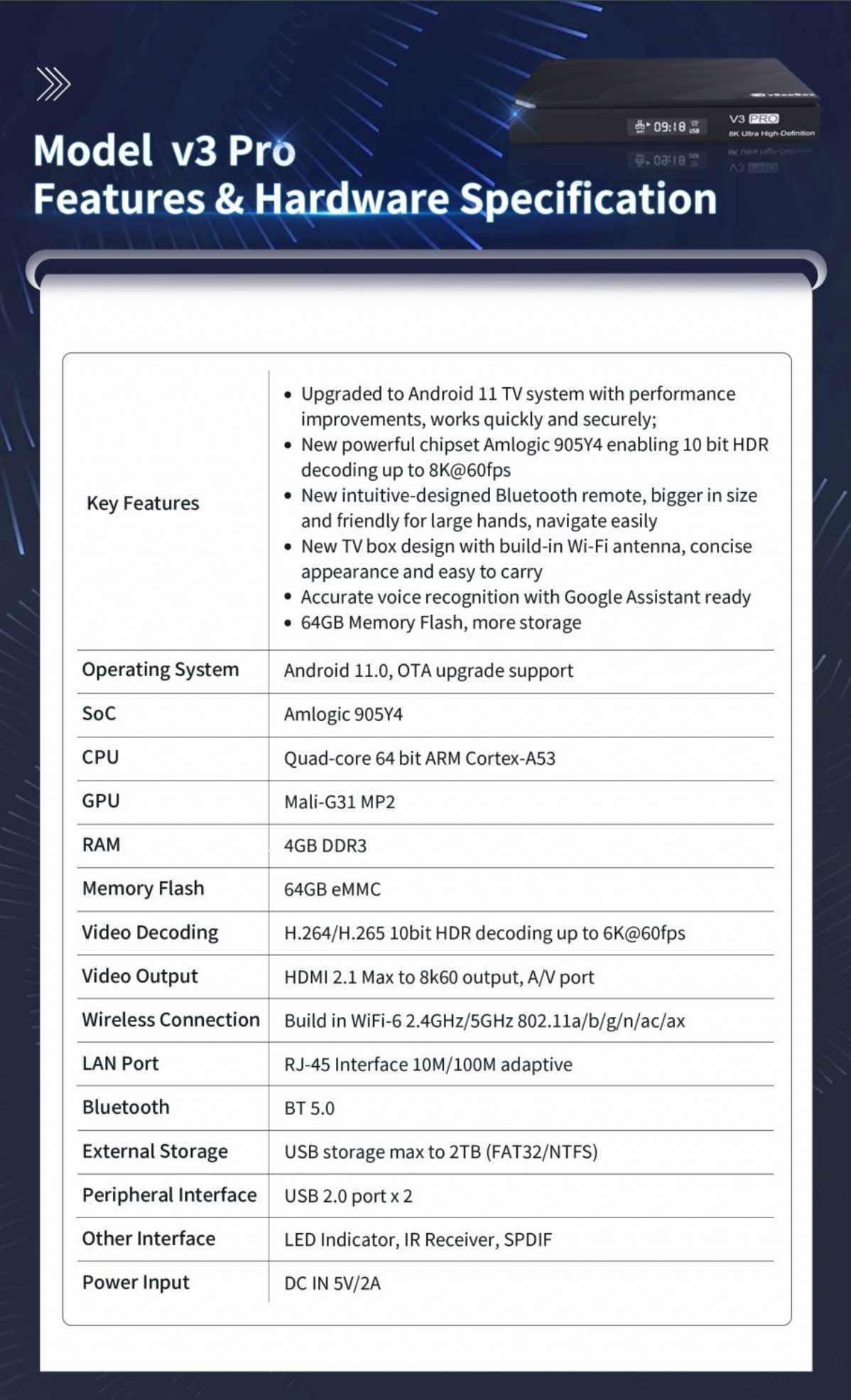 • New powerful chipset Amlogic 905Y4, enabling 10 bit HDR decoding up to 8K@60fps;